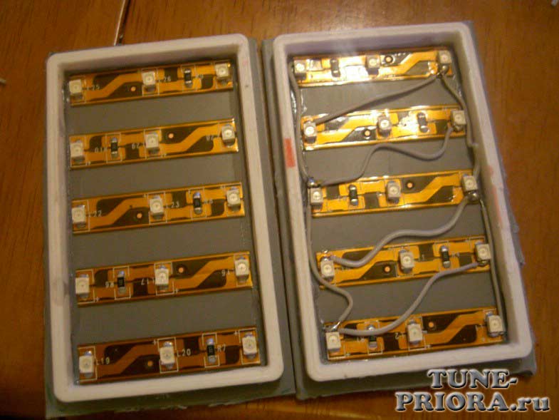 Были приобретены катафоты дверей от ВАЗ-2108. Аккуратно их разбираем, и выясняем, что светодиодная лента не помещается внутри: между белым пластиком и оргстеклом практически нет места. Пришлось выпиливать среднюю часть белого пластика, оставив только рамку. Рамку наклеиваем дихлорэтаном (используется для клейки детских моделей самолетов и кораблей) на лист серого полистирола, внутрь приклеиваем 5 отрезков ленты, очищенной от мягкого прозрачного пластика.