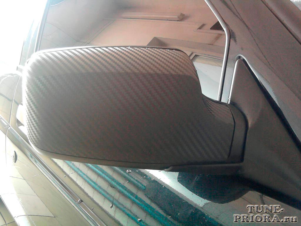 Решил изменить немного внешность своей приоры, обклеив зеркала пленкой под карбон.